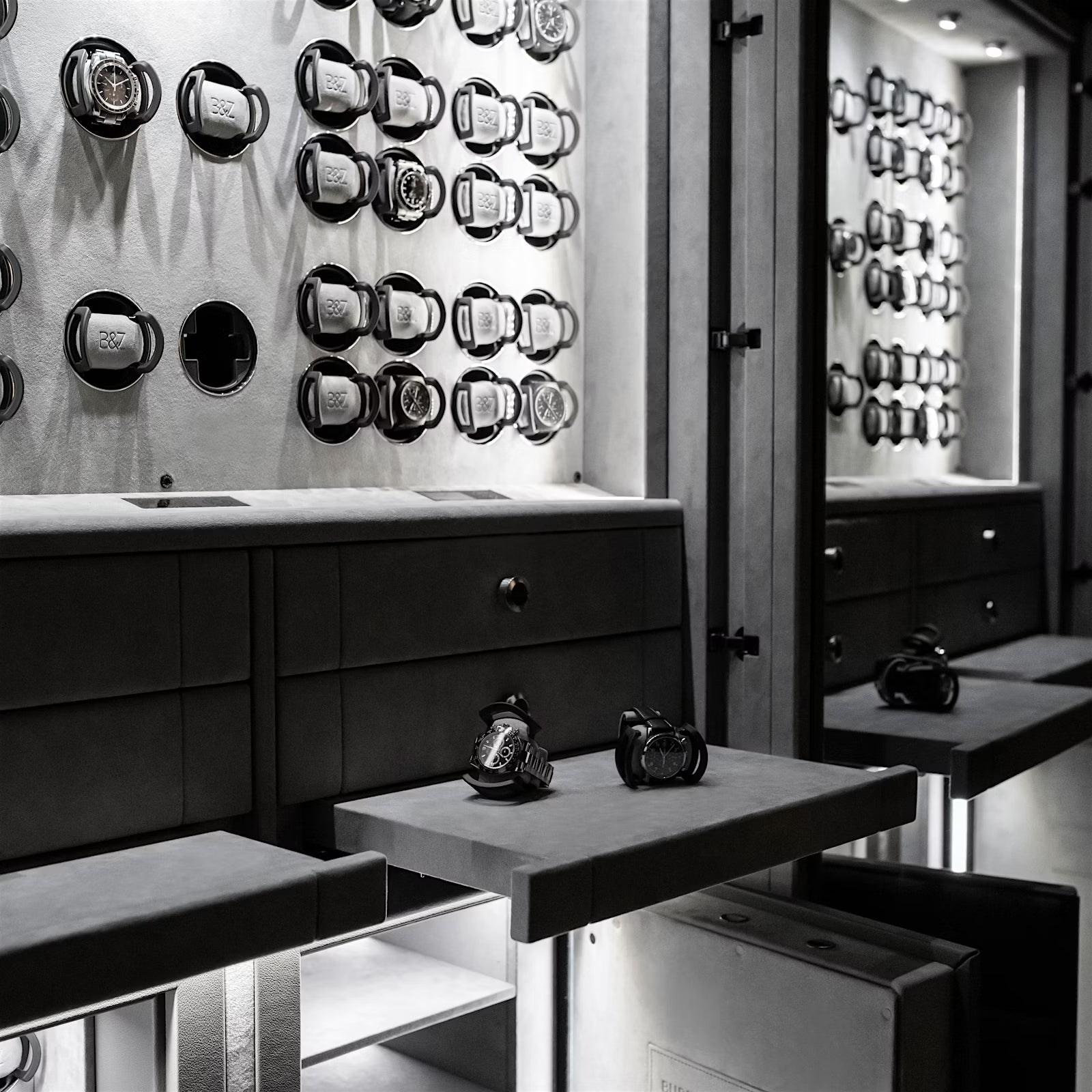 The aim was a secure and elegant solution for displaying and storing an extensive collection of watches and jewellery – tailor-made, of the highest possible technical quality and in the customer's preferred colour scheme: shades of grey in the finest Nappa and velours leather. The result of our expert team at B&Z Bespoke Manufaktur working closely and trustingly with the customer: the personal masterpiece 'Grey Symphony'. A holistic and individually designed high-security safe that gives our customer's favourite items a timelessly stylish appearance. The safe becomes the stage for the breathtaking orchestra of an extraordinary collection.