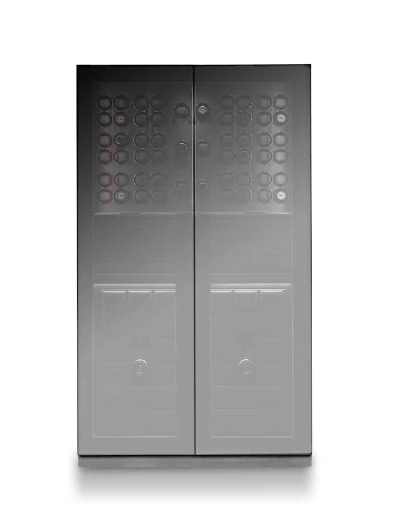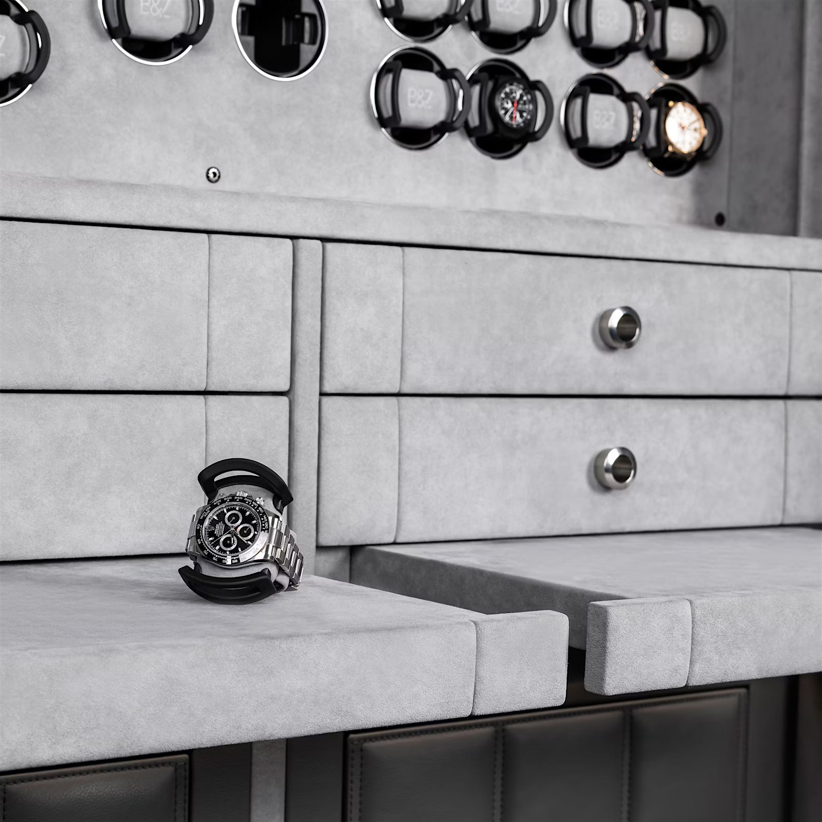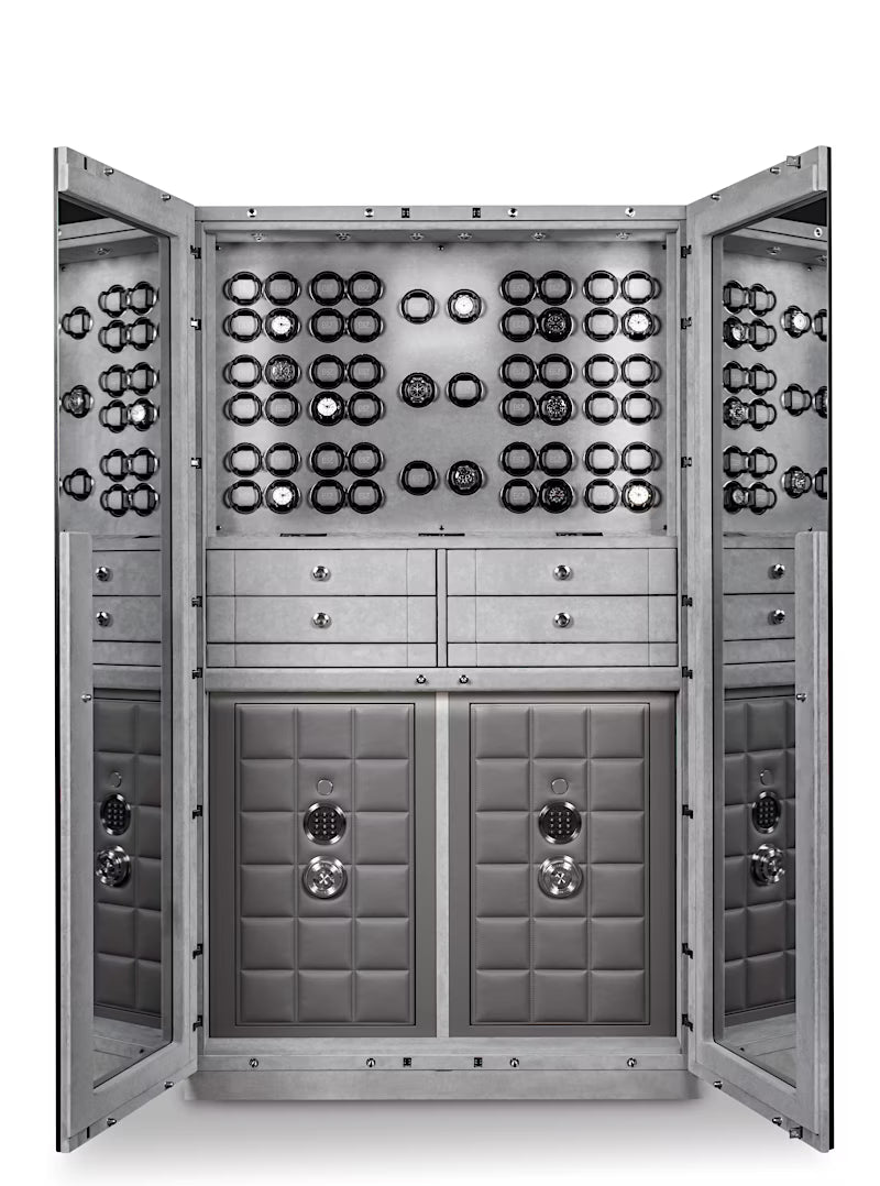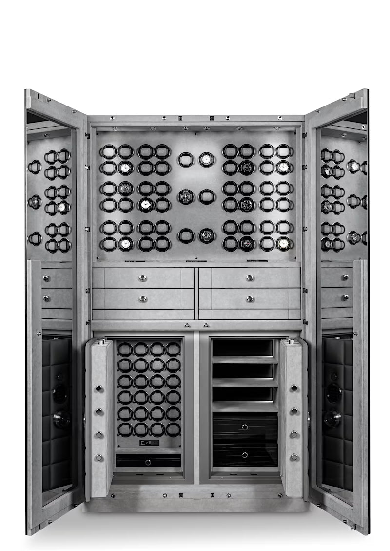 Behind the mirrored glass doors with a comfort opening mechanism unfolds a finely tuned interplay of exquisite materials, precise technology, and thoughtful interior design. A key highlight is the innovative lighting concept. The LED lighting with fading function can be controlled remotely and sets the mood for favourite timepieces. In the upper section, the owner has access to 54 watch winders featuring the latest TIME MOVER® Technology, as well as four elegant drawers equipped with finely tuned inserts for watches and jewellery.