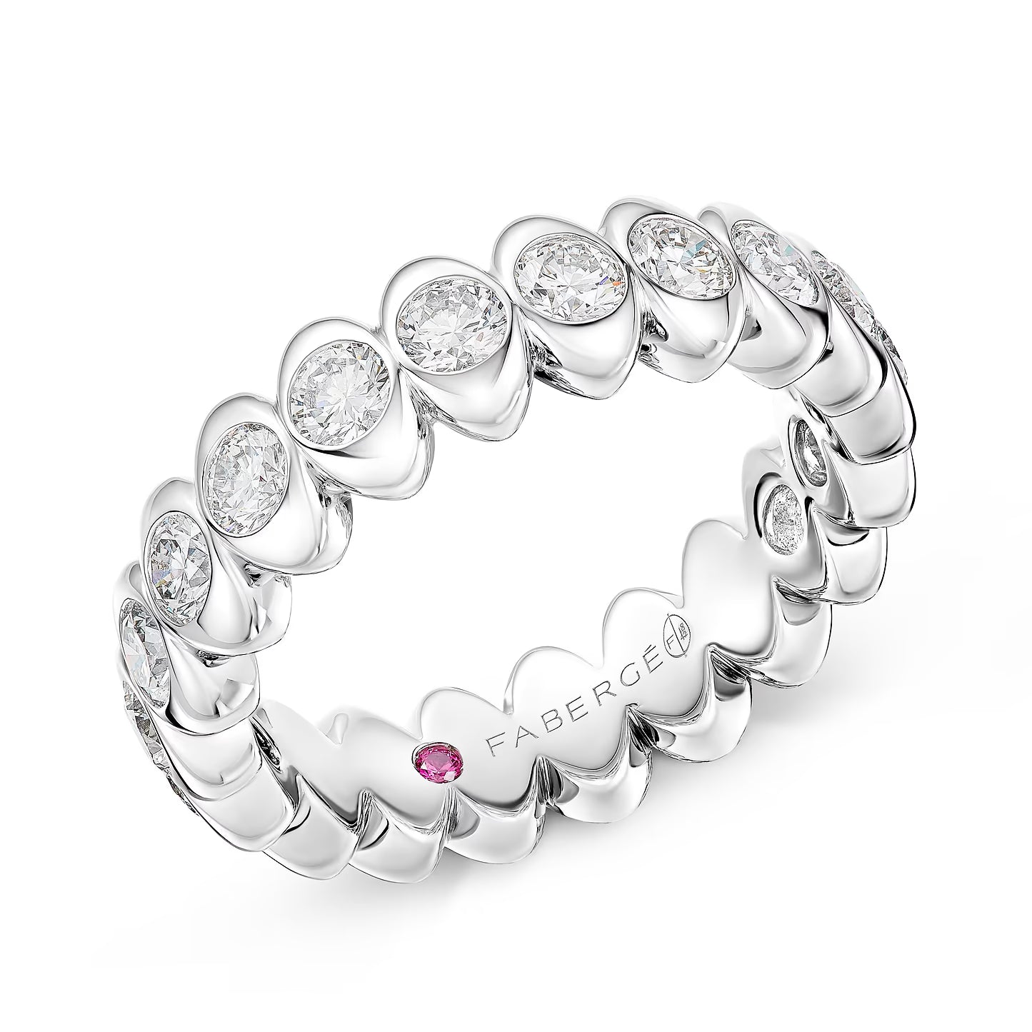 The Cosmic Curve Eternity Ring celebrates the power of forever love with twenty round cut diamonds that boldly reinterpret a classic jewellery piece. Finely crafted in platinum, this radiant diamond ring is a testament to the Maison's captivating savoir-faire and excellence. A concealed ruby on the inside of the band brings an element of surprise known only to its wearer.