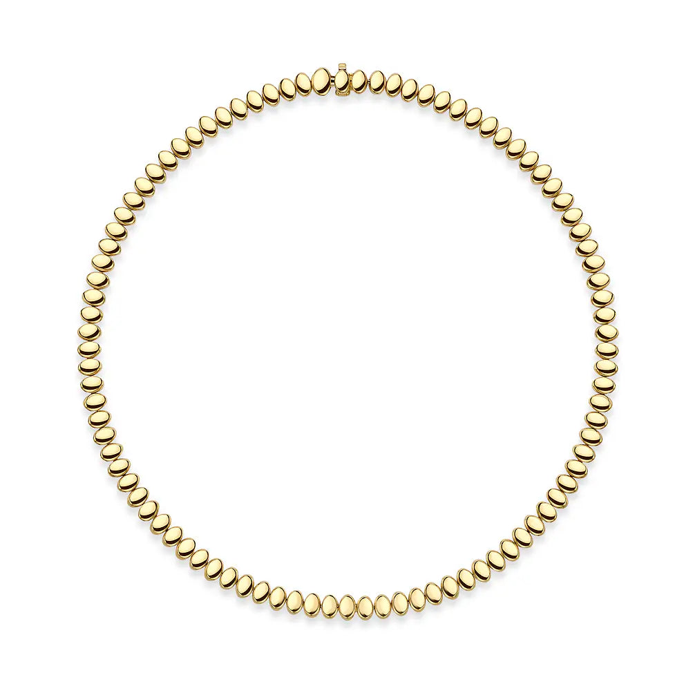 Crafted from 18k yellow gold, the Cosmic Curve Tennis Necklace is a monochromatic statement of eternity and meticulous geometry. The necklace features a repeated egg motif with uniquely carved facets that boldly reveal the versatility of gold. A spectacular play of light shapes this piece of jewellery into a luminous golden treasure - a testament to the Maison's captivating savoir-faire and excellence. A concealed ruby brings an element of surprise known only to its wearer.
