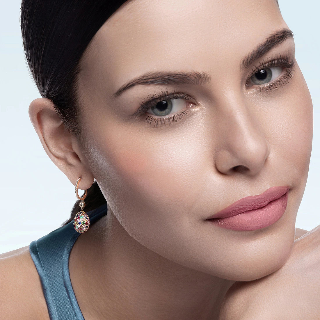 The Emotion Yellow Gold Multicoloured Gemstone Egg Drop Earrings feature multicoloured sapphires, red rubies, green emeralds, green tsavorites and white diamonds - set in 18 karat yellow gold.