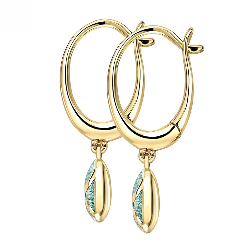 The Heritage Rose Gold Diamond & Pink Guilloché Enamel Hoop Drop Earrings are set in 18 karat rose gold and adorned with pink enamel eggs, each containing one round brilliant cut white diamond. The egg shape is 7.5mm in height.