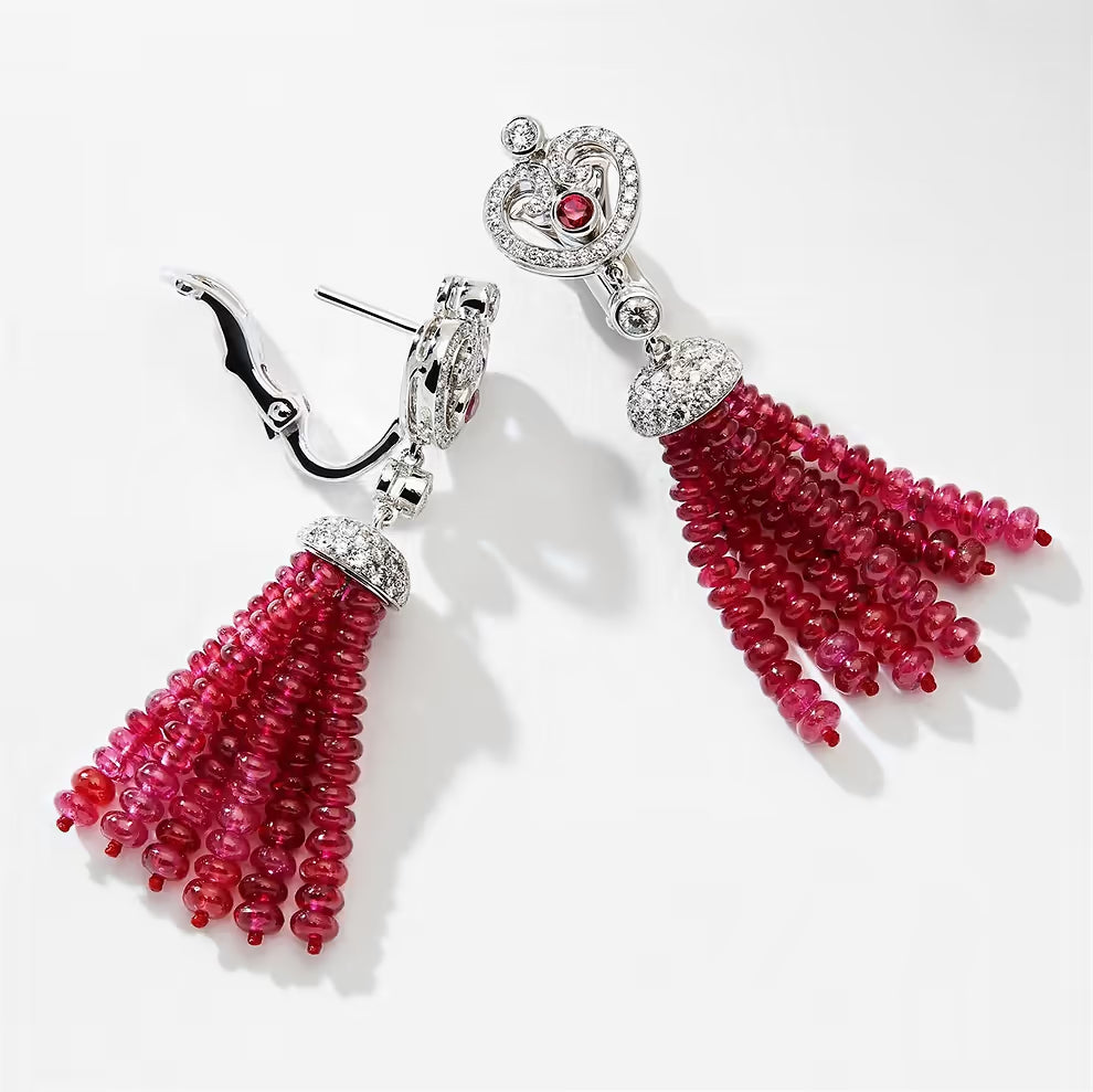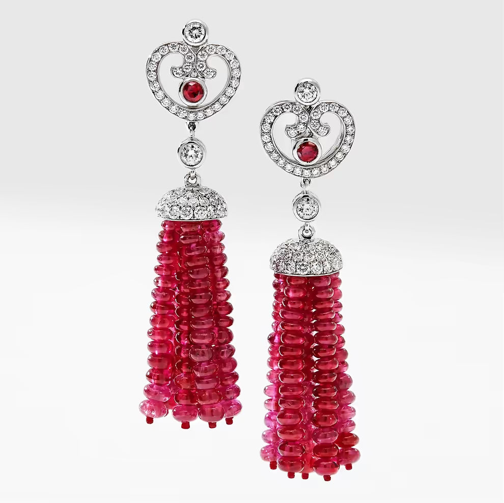 Impératrice Ruby Tassel Earrings feature round ruby centre stones surrounded by white diamonds, with a tassel of ruby beads, set in 18 karat white gold.