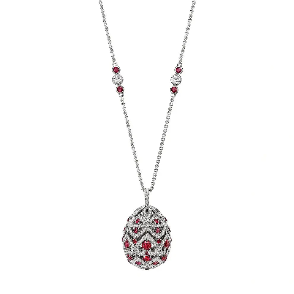 Zenya Ruby Pendant features round white diamonds and round rubies, set in 18 karat white gold. The egg pendant is 26mm.
