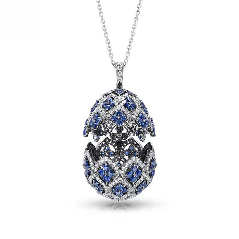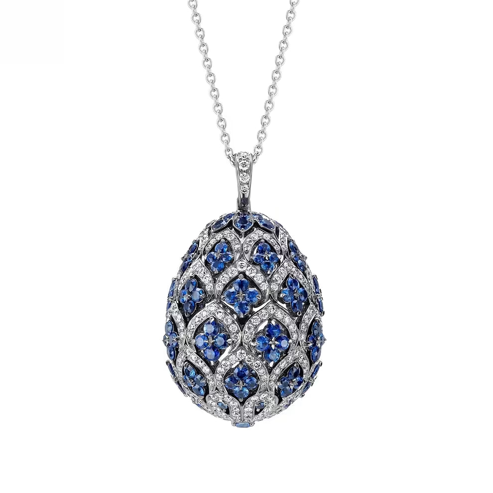 Zenya Ruby Pendant features round white diamonds and round rubies, set in 18 karat white gold. The egg pendant is 26mm.